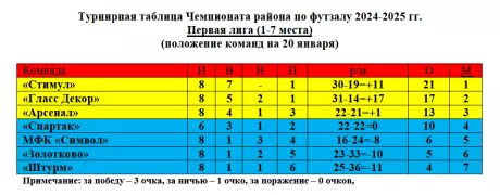 В воскресенье, 19 января, в спортивном комплексе имени Ю.Н. Каперского в г. Курлово завершились игры предварительного этапа чемпионата района по футзалу среди команд первой лиги. Свои очередные матчи провели команды, оспаривающие места с 1 по 7. В них были зафиксированы следующие результаты: