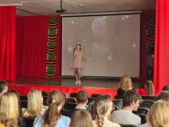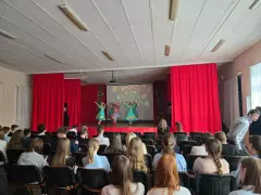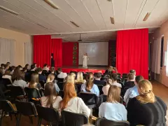 17 февраля 2025 года благодаря Национальному проекту "Культура". Пушкинская карта на сцене концертного зала МБОУ СОШ №10 прошла встреча творческого коллектива МБУК «Ескц» с учащимися старших классов на интеллектуально-познавательном, развлекательном, интерактивном мероприятии «ПУСТЬ МИРОМ ПРАВИТ ДОБРОТА».