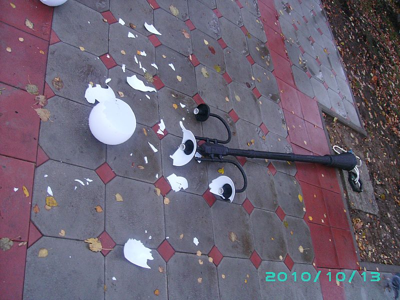 Но не успели благовоспитанные гусевчане порадоваться преобразившимся обликом любимого места отдыха, как случился новый акт вандализма. Ненастным осенним утром 13 октября, пассажиры общественного транспорта, прохожие, спешащие на работу, были поражены увиденным. На выполненном в традиционных для Гусь-Хрустального бело-красных тонах тротуаре набережной, лежал поверженный кем-то фонарь! Матовые осколки плафонов, как невинные жертвы чьей-то агрессии, рассыпались по только что выложенному плиточному покрытию.