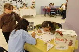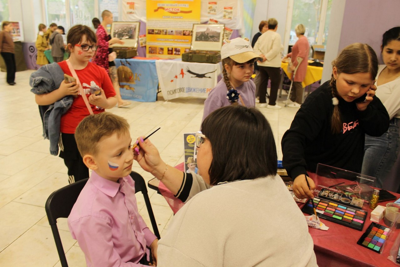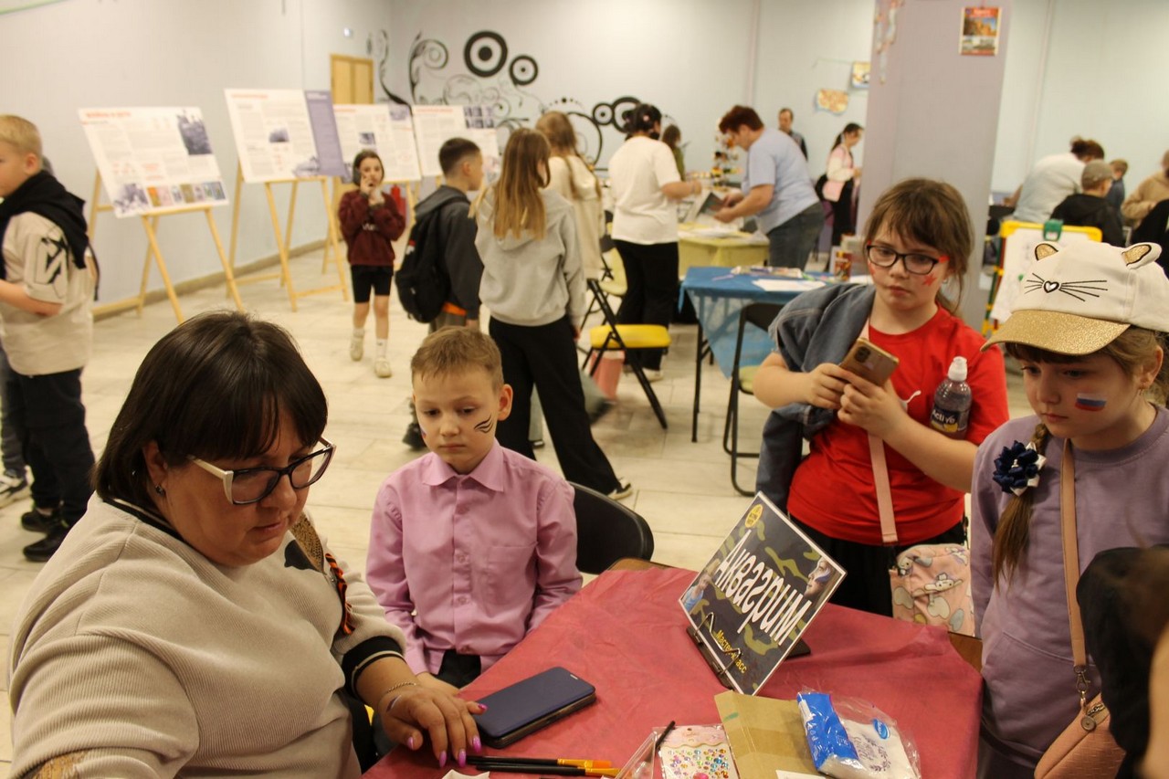 Желающие делали памятные снимки в тематической фотозоне, посвященной предметам военного времени. Юные участники раскрашивали тематические рисунки.