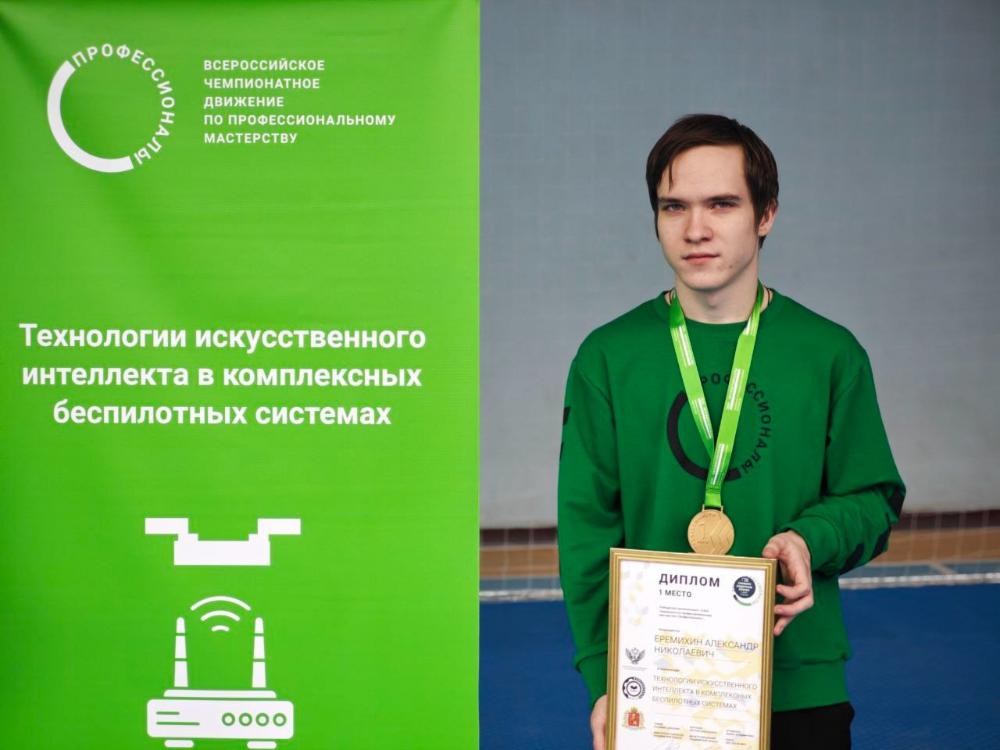«Золото» в компетенции «Технологии искусственного интеллекта в комплексных беспилотных системах» взял Александр Еремихин, студент Высшей государственной инженерно-технической школы (колледжа) им. Д.К.Советкина (Владимирского авиамеханического колледжа). Экспертом-наставником победителя выступил преподаватель Михаил Красавин.