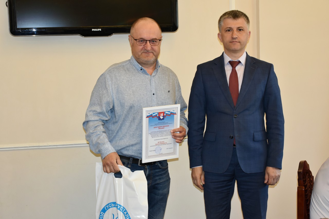 Благодарственными письмами главы города награждены предприниматели и их коллективы за вклад в развитие предпринимательства, оказание благотворительной помощи и помощи семьям военнослужащих. В числе награжденных общественный помощник уполномоченный по защите прав предпринимателей по Владимирской области в г.Гусь-Хрустальном, председатель координационного совета в области развития малого и среднего предпринимательства в нашем городе Яна Барихашвили; общественный помощник уполномоченного по защите прав предпринимателей по Владимирской области в г.Гусь-Хрустальном Вадим Пащенко; индивидуальные предприниматели Наталья Шереметьева, Алла Шалаева, Сергей Исаев, Андрей Фадеев, Дмитрий Вернов, Андрей Булыгин, Сергей Бубякин, Иван Филатов.