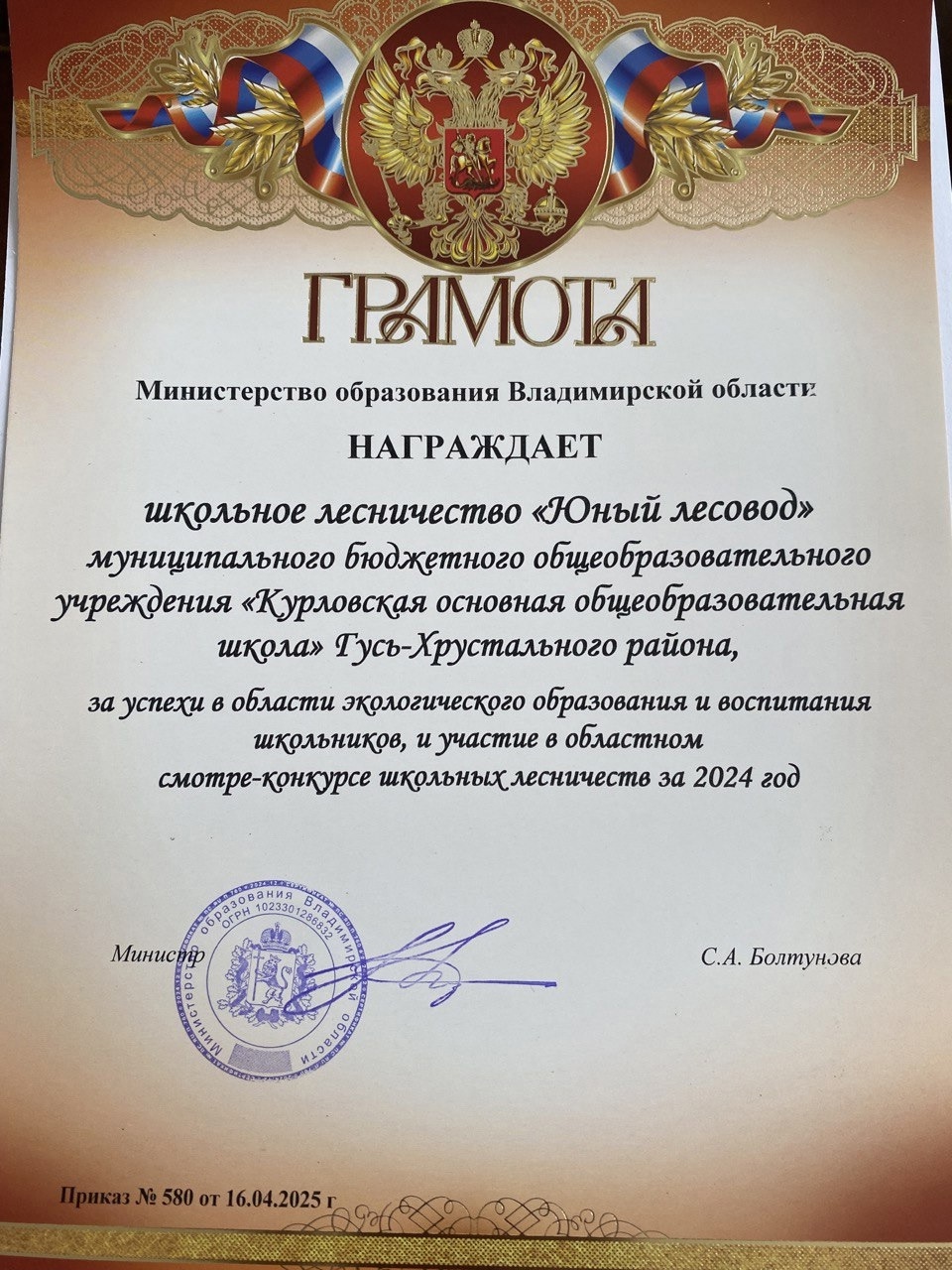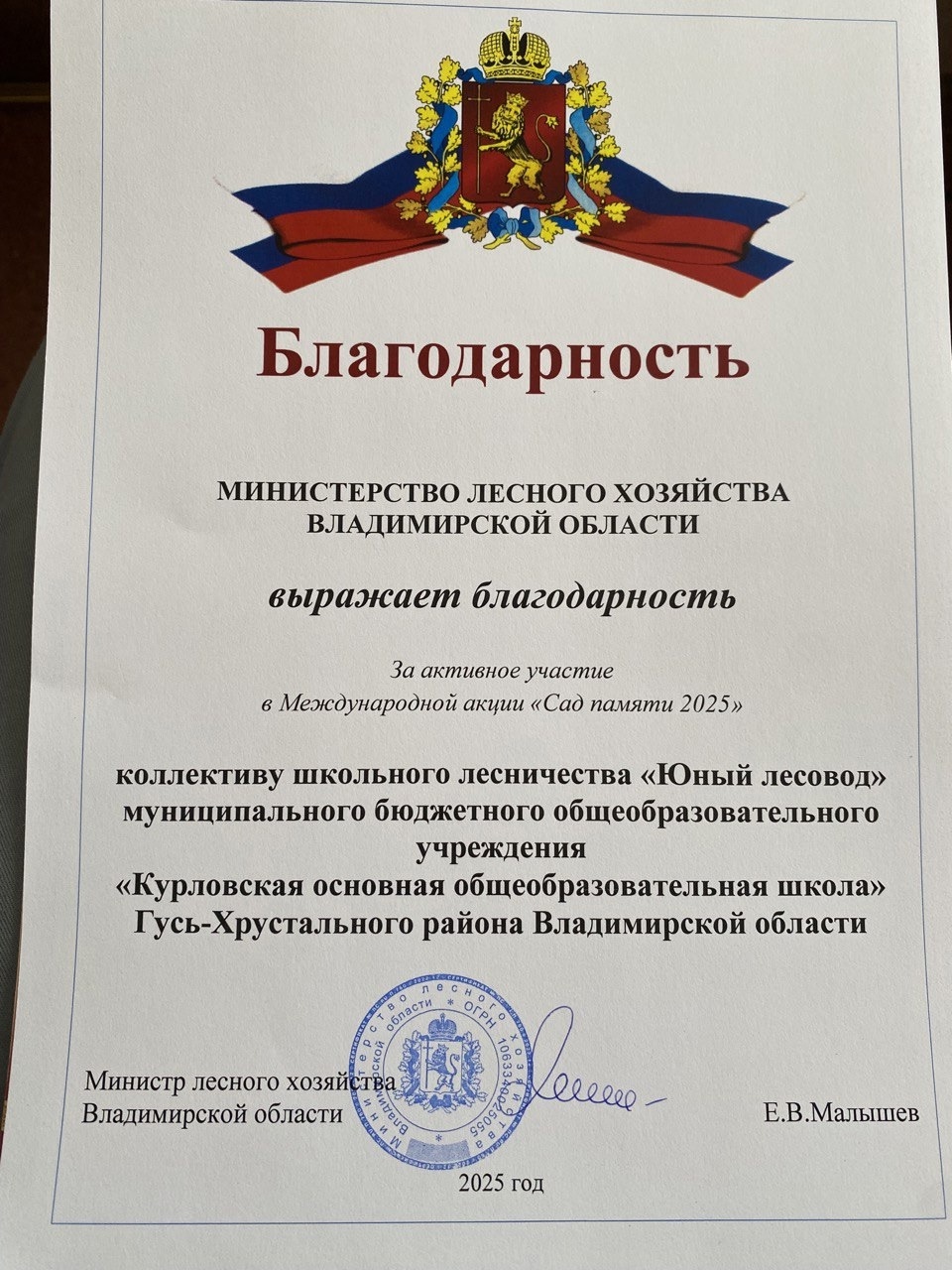 Школьное лесничество «Юный лесовод» руководитель, которого Симачкова Е.Л. получило грамоту в областном конкурсе школьных лесничеств от министерства образования и получена благодарность от министерства лесного хозяйства Владимирской области коллективу школьного лесничества за активное участие в Международной акции «Сад памяти 2025».