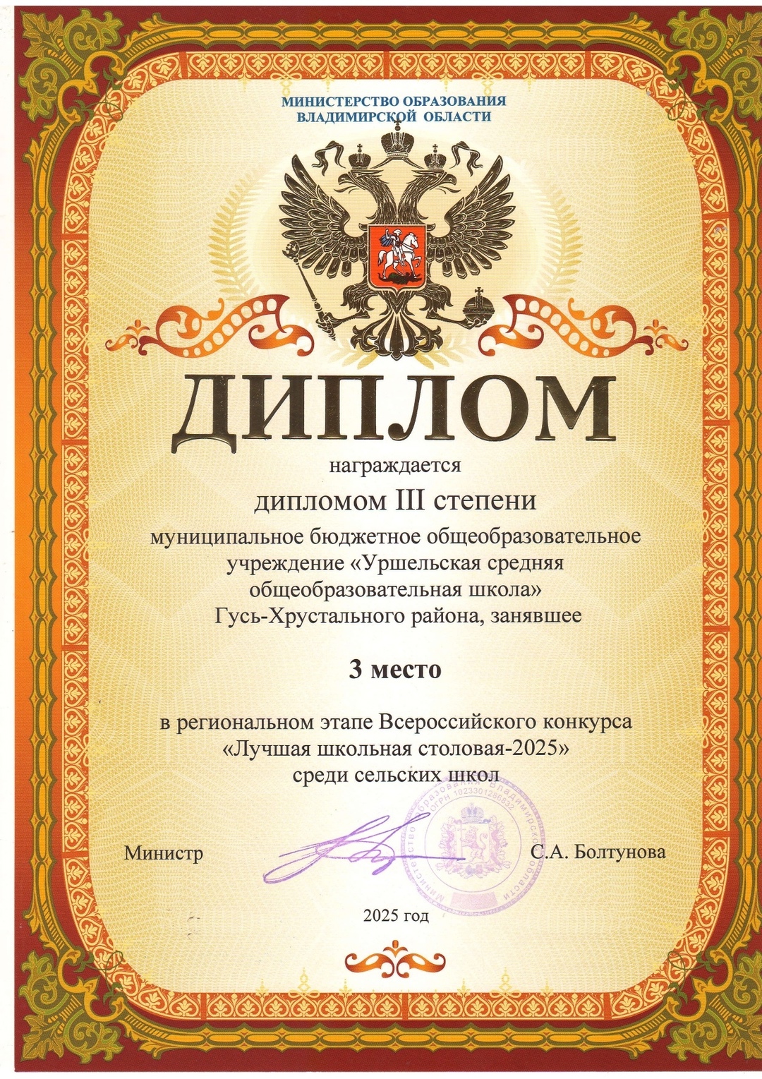 С 15 апреля по 30 мая 2025 года были проведены муниципальный и региональный этапы Всероссийского конкурса «Лучшая школьная столовая». В региональном этапе конкурса приняли участие 16 общеобразовательных организаций области. Гусь-Хрустальный район на конкурсе представляла Уршельская средняя общеобразовательная школа, которая стала призером конкурса и заняла почетное III место среди сельских школ.