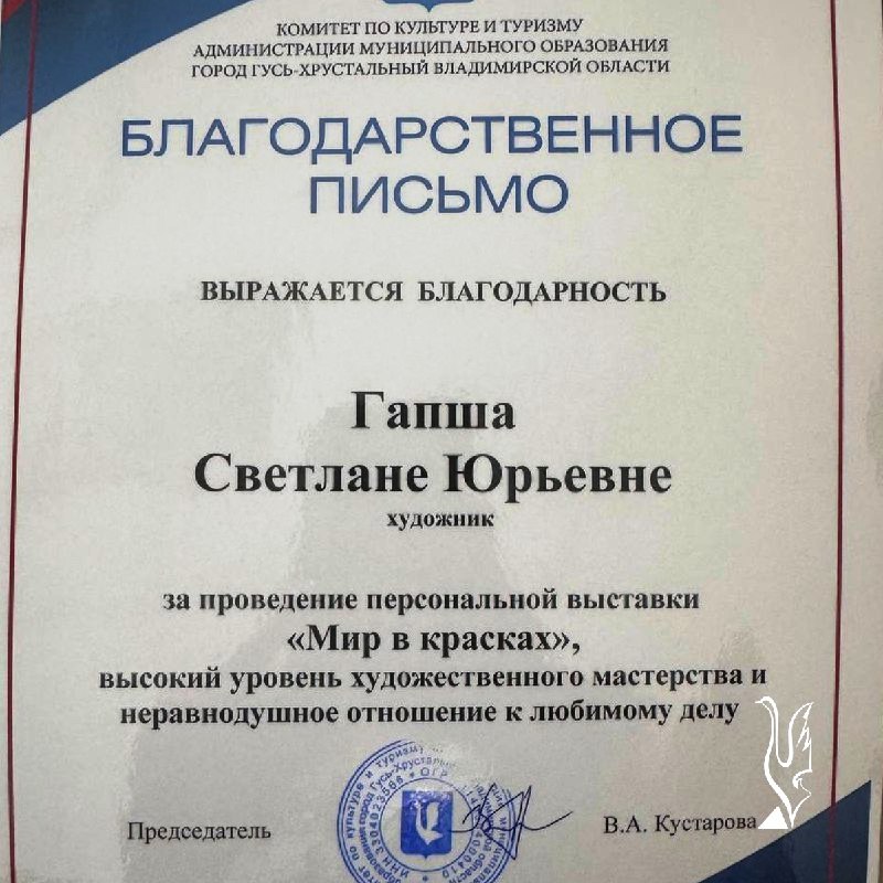 Председатель комитета по культуре и туризму Валентина Кустарова, присутствовавшая на открытии выставки, выразила признательность Светлане Гапша за творчество и самобытность, вручив художнице благодарственное письмо и памятные подарки.