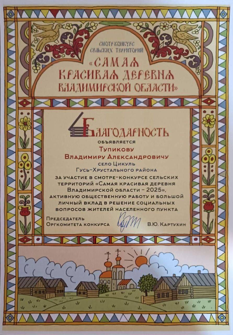 - Село Цикуль было удостоено звания «Самое духовное село». За участие в смотре-конкурсе «Самая красивая деревня Владимирской области — 2025», активную общественную работу и большой личный вклад в решение социальных вопросов жителей населенного пункта благодарностью и подарками был отмечен иерей церкви спас Преображения села Цикуль отец Владимир.