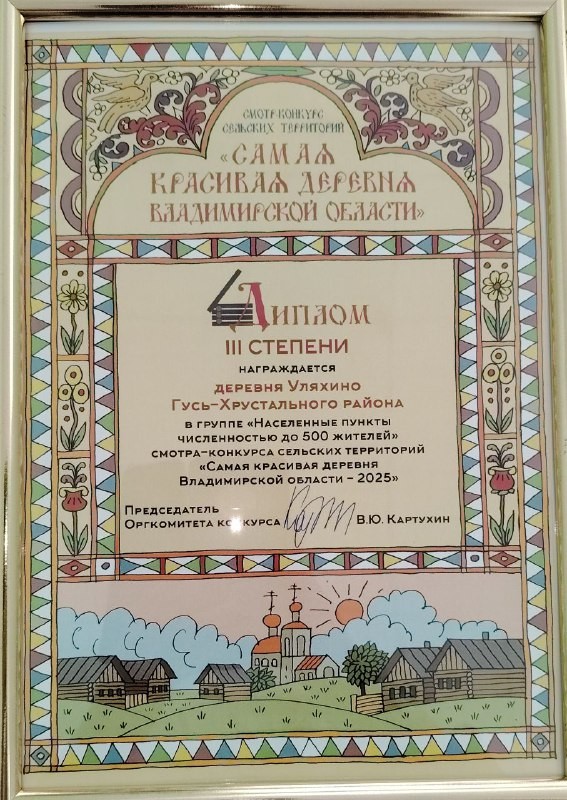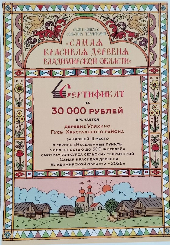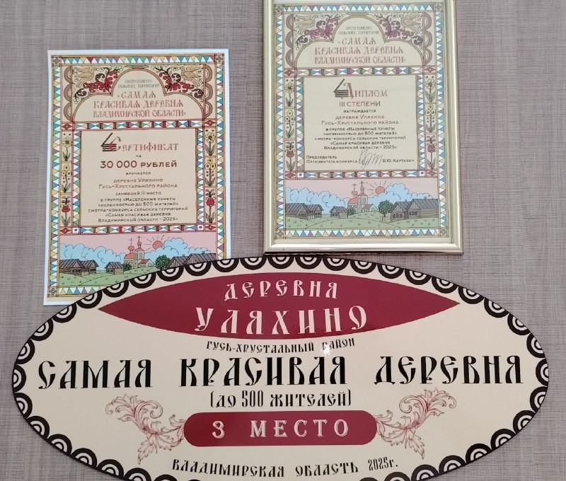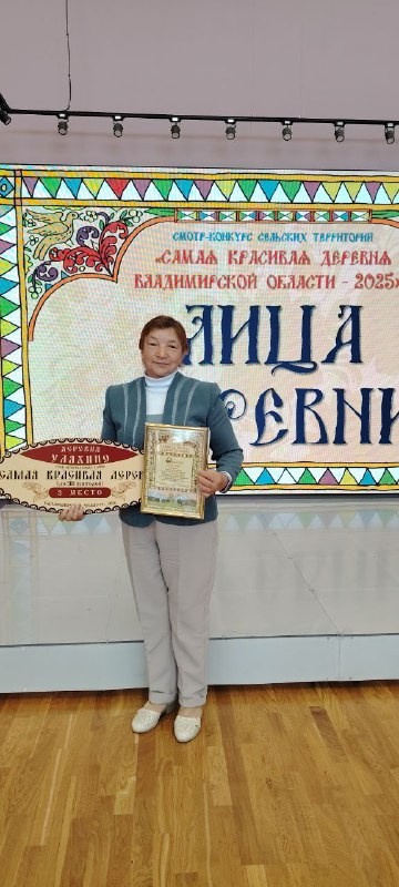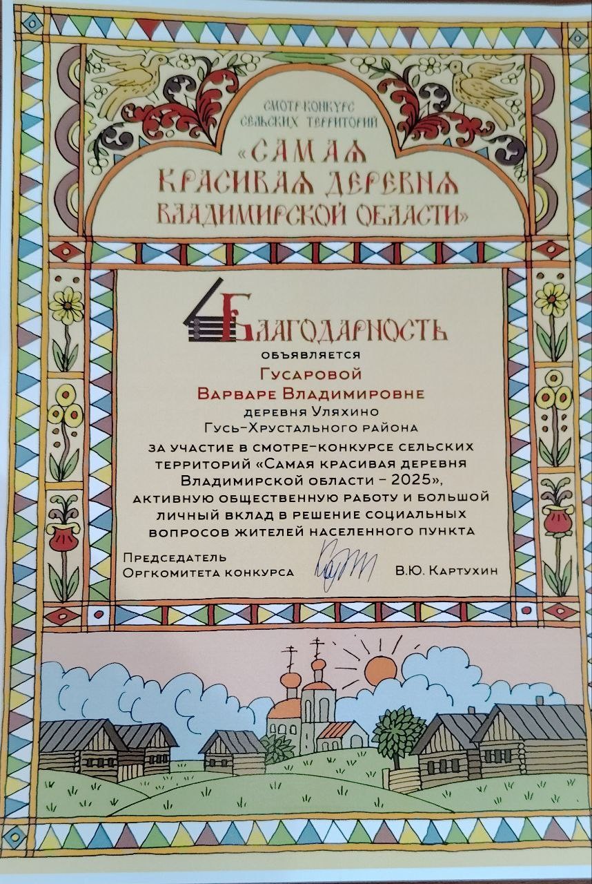 - За участие в смотре-конкурсе «Самая красивая деревня Владимирской области — 2025», активную общественную работу и большой личный вклад в решение социальных вопросов жителей населенного пункта от деревни Уляхино благодарностью была отмечена Варвара Гусарова.
