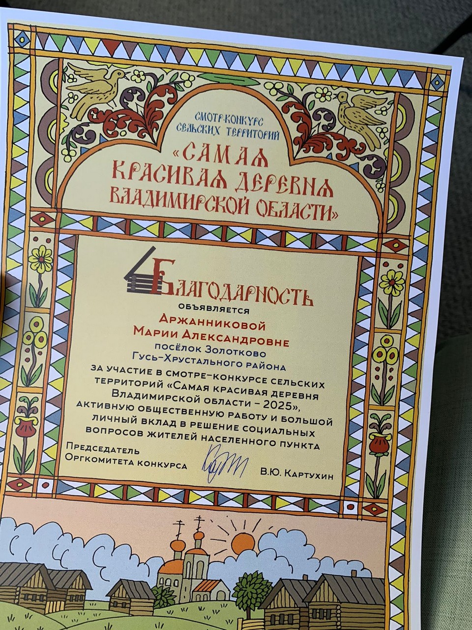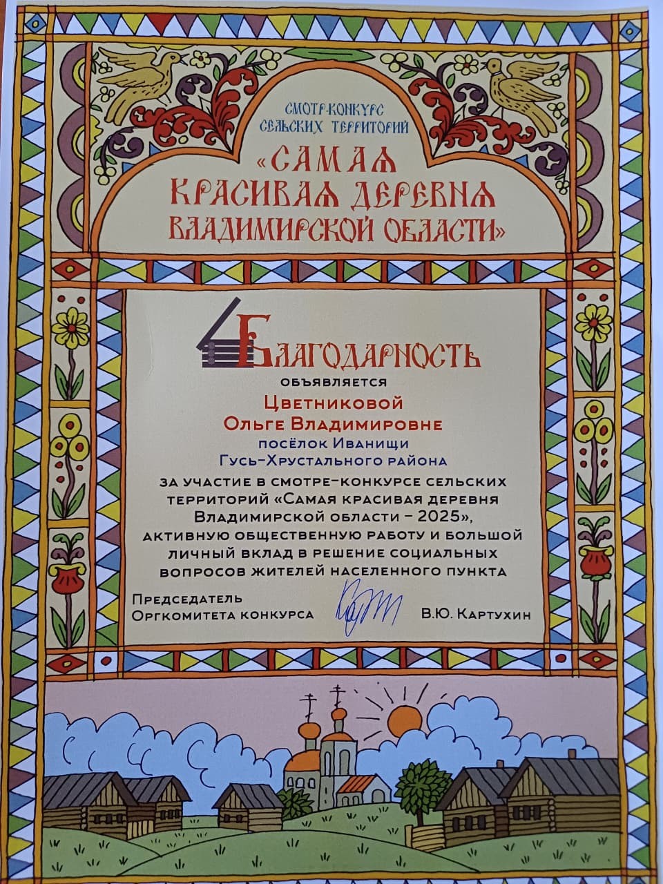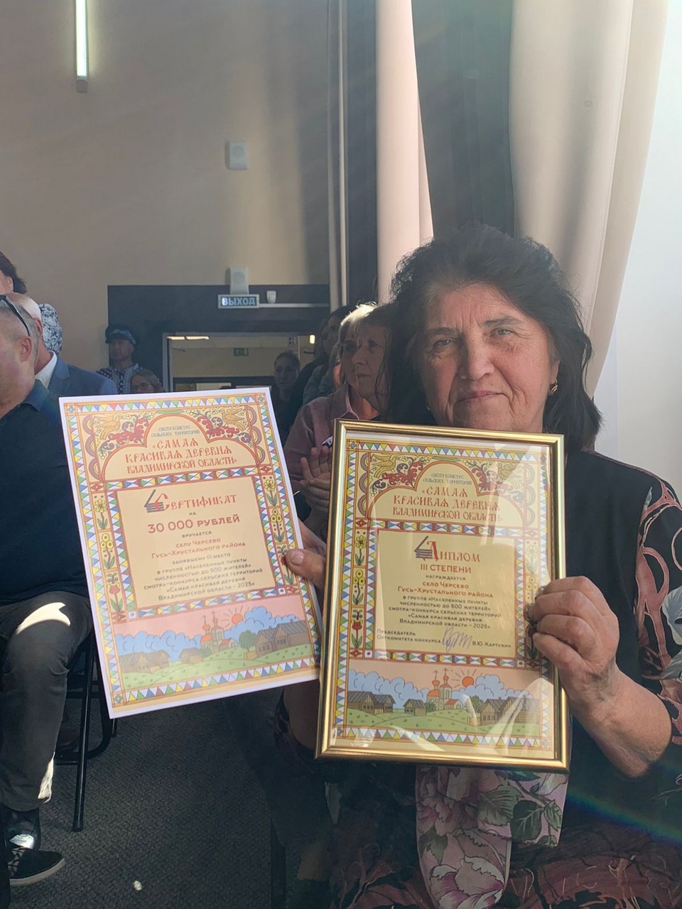 - За участие в смотре-конкурсе «Самая красивая деревня Владимирской области — 2025», активную общественную работу и большой личный вклад в решение социальных вопросов жителей населенного пункта от деревни Уляхино благодарностью была отмечена Варвара Гусарова.