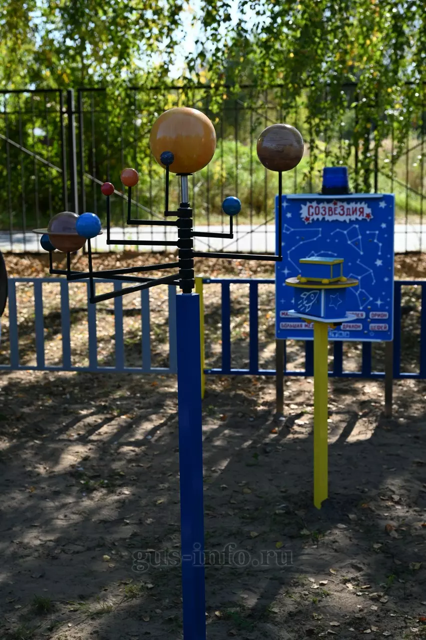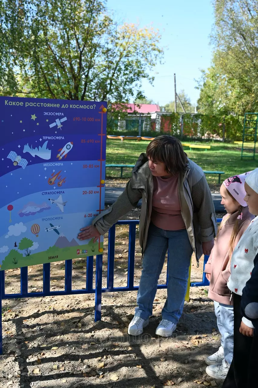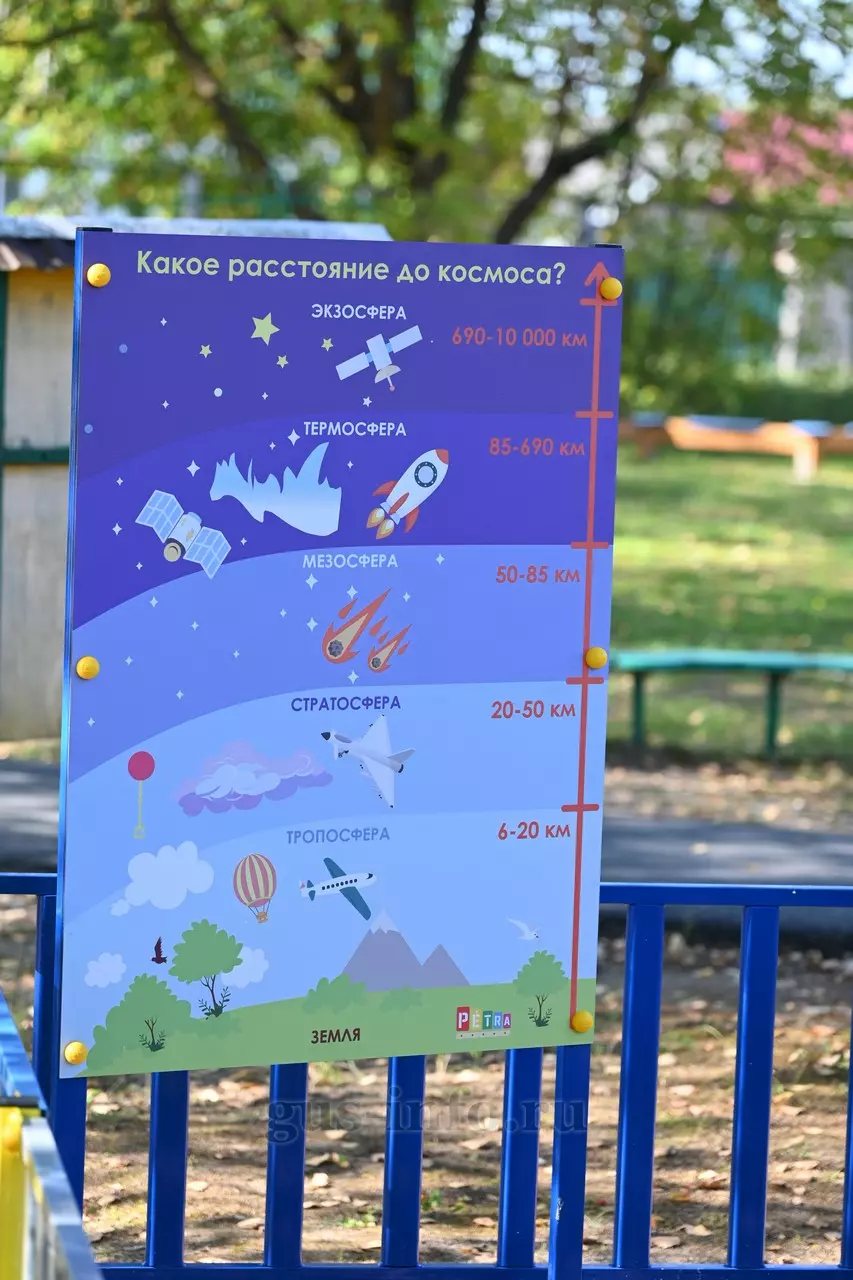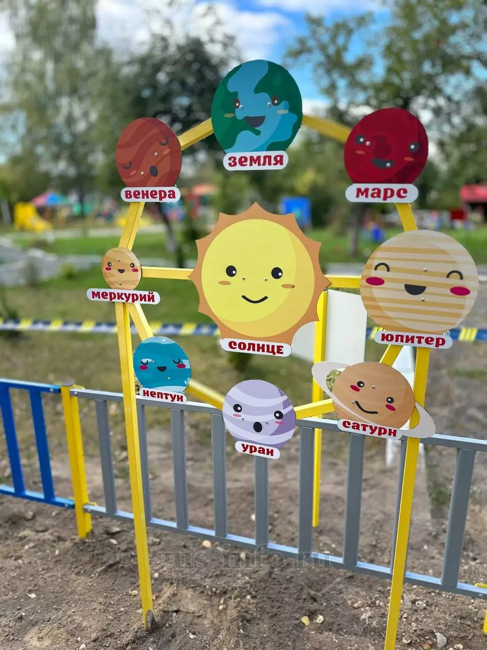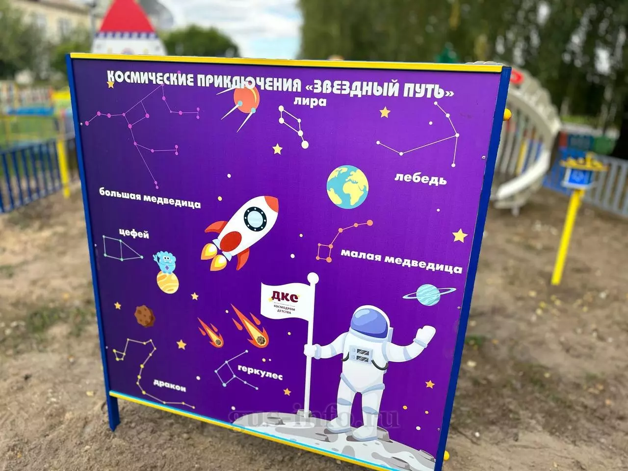 Интерактивная площадка направлена на развитие уличного пространства детского сада, который обслуживает более 250 детей. Она представляет собой комплекс, в состав которого входят красочные стенды и макеты. С их помощью дошкольники осваивают азы астрономии и получают представление о космическом пространстве.