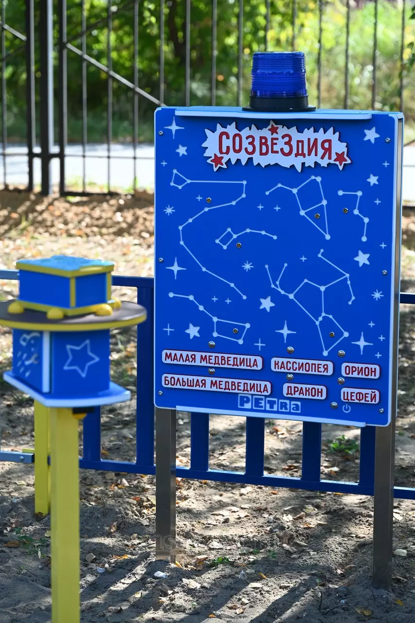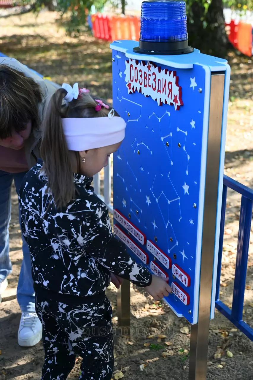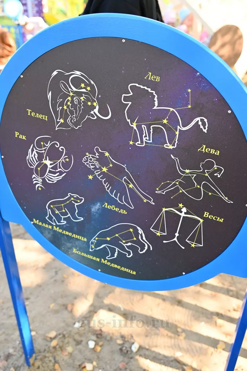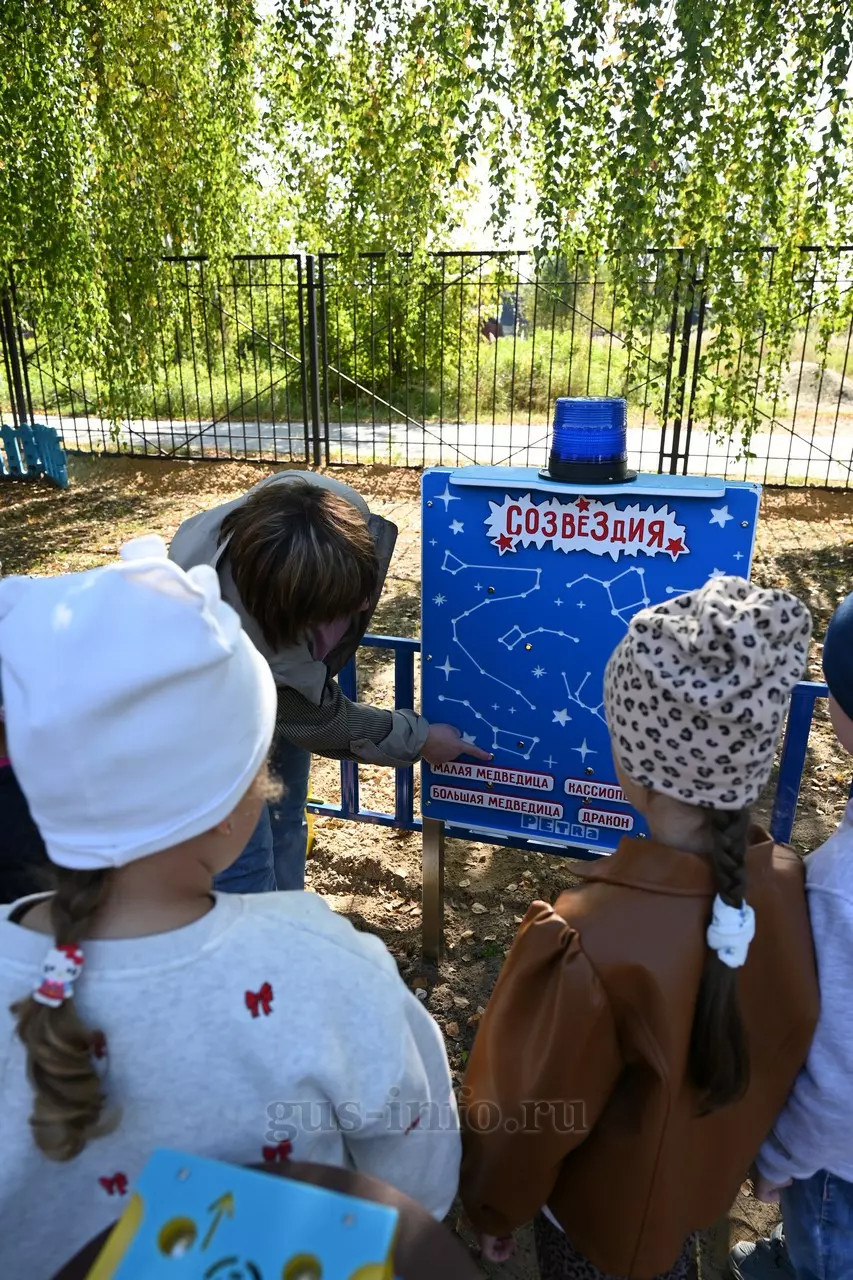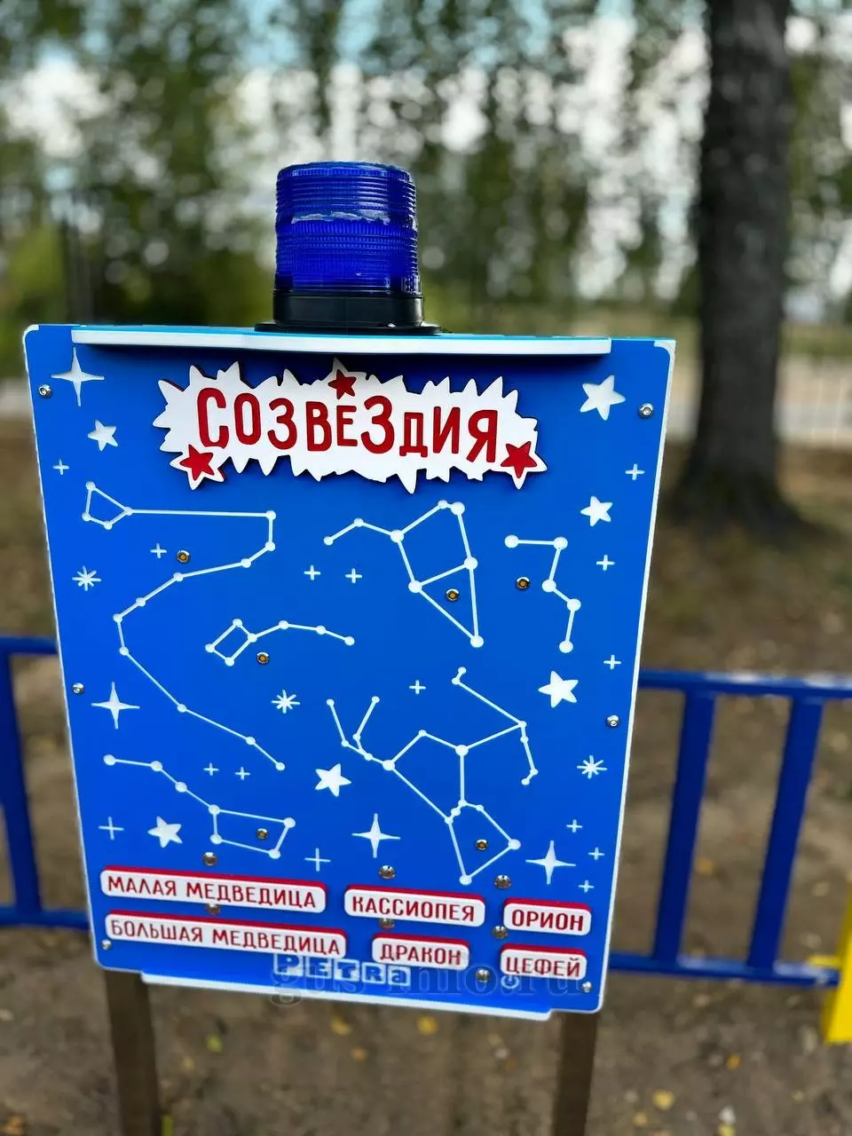 С удовольствием юные жители поселка изучают созвездия. Несколько стендов посвящены этой теме, и на одном из них дети могут закрепить свои знания, нажимая на кнопки. При правильном ответе на информационном щите зажигается лампочка.