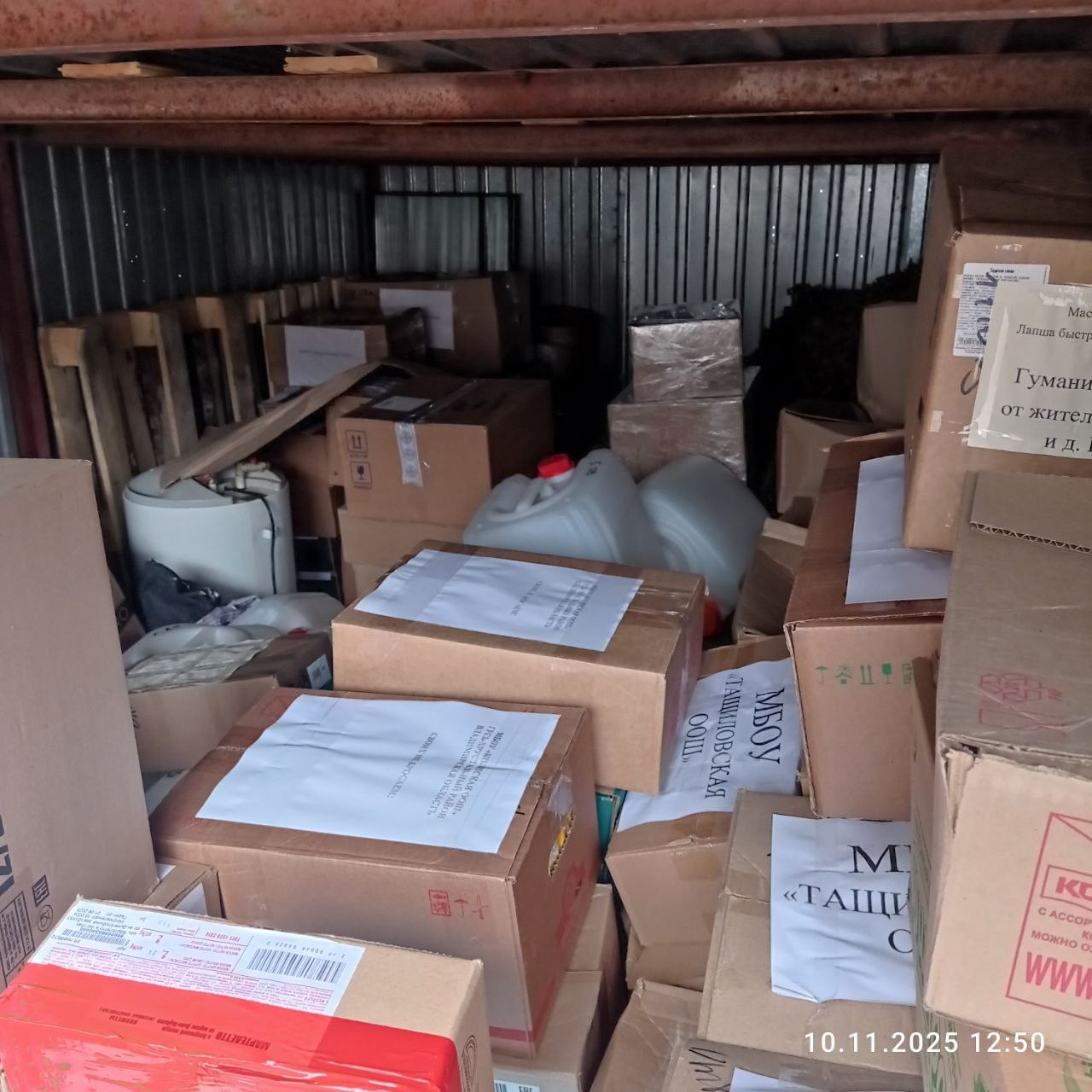 В состав груза вошли: 2 мотоцикла, моторное масло, 4 портативной электростанции, 2 дизельных генератора, жидкость техническая для 4 тактных двигателей, емкости 30, 200 и 1000 литровые, вода бутилированная (0,5 л., 1,5 л., 5 л.) 350 штук, свечи 500 шт, маскировочные сети 25 шт, автомобильные шины 4 шт, медикаменты, огнетушители 65 шт, гуманитарная помощь (домашнее консервирование, продукты питания, нижнее бельё, носки, перчатки, средства гигиены, одеяла) 49 коробок, провода ПВС 200 погонных метров, вилки электрические 10 шт.