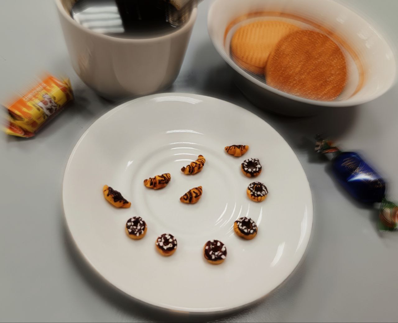 Участники решили «испечь» пончики и круассаны из глины и попили с ними чайку.)
