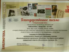 Так, в номинации «Сельские библиотеки-филиалы (структурные подразделения учреждений)» дипломом III степени удостоена Григорьевская библиотека-филиал Межпоселенческой центральной библиотеки Гусь-Хрустального района за проект «Мы этой памяти верны». При подготовке к его мероприятиям была проведена большая работа с музейными экспонатами и фронтовыми письмами. Они были расшифрованы и подготовлены к видео-прочтению.