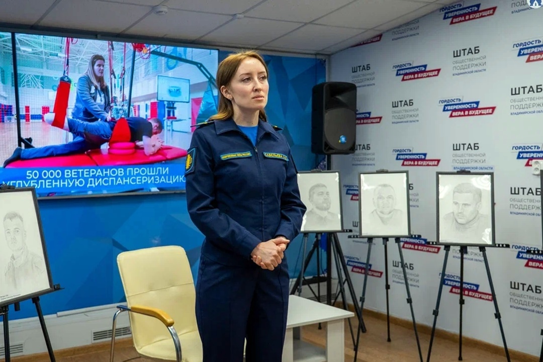 На площадке Штаба общественной поддержки во Владимире начала работу выставка Анастасии Савельевой «Подвиг в лицах». На её открытие пригласили ветеранов специальной военной операции и родных погибших героев, чьи портреты были написаны в рамках проекта, реализованного при поддержке Владимирского филиала фонда «Защитники Отечества».