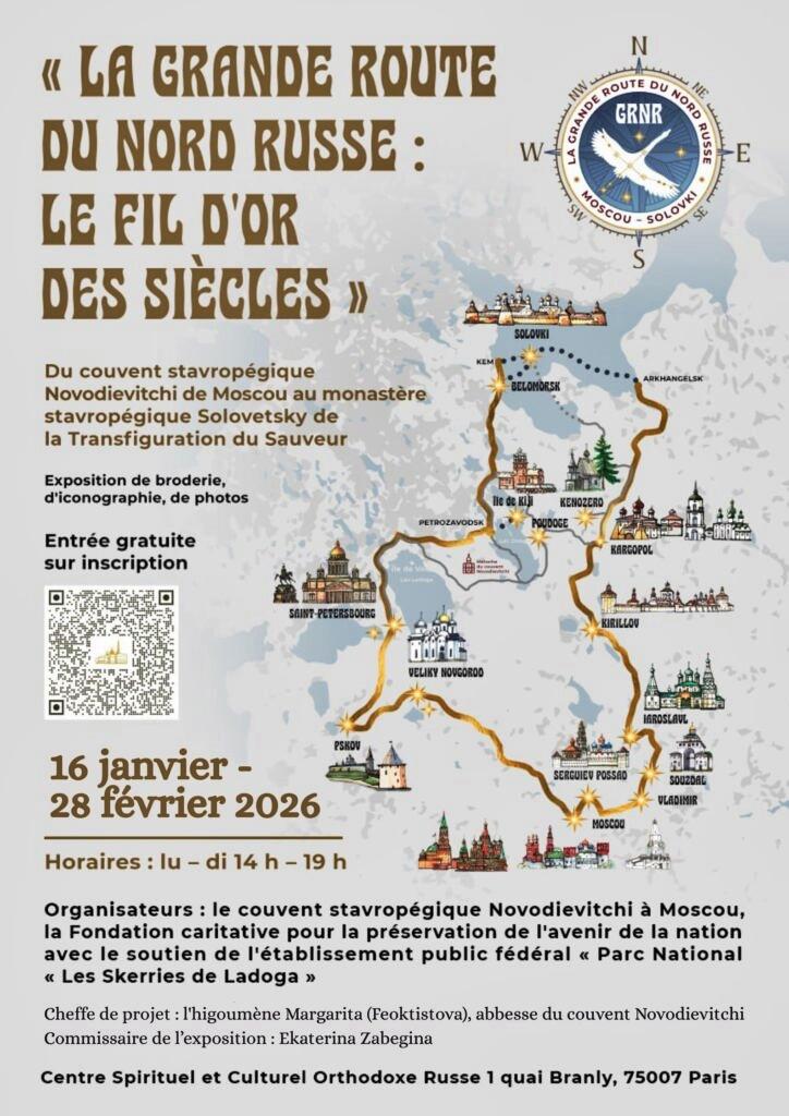 15 января в Российском духовно-культурном православном центре в Париже открылась выставка «Великий русский северный путь. Золотая нить столетий». Она представляет просветительский, историко-патриотический, паломнический и экологический маршрут, проходящий через 12 регионов России и объединяющий 14 объектов Всемирного наследия ЮНЕСКО.