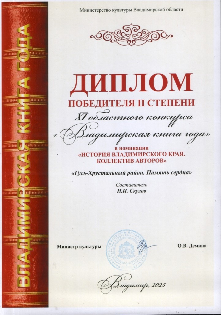 Издание «Память сердца. Гусь-Хрустальный район», посвящённое трудовому и боевому подвигу земляков в годы Великой Отечественной войны, стало лауреатом XI регионального конкурса «Владимирская книга года». На торжественной церемонии в областной научной библиотеке книга была удостоена диплома победителя II степени в номинации «Владимирский край. История. Коллектив авторов».