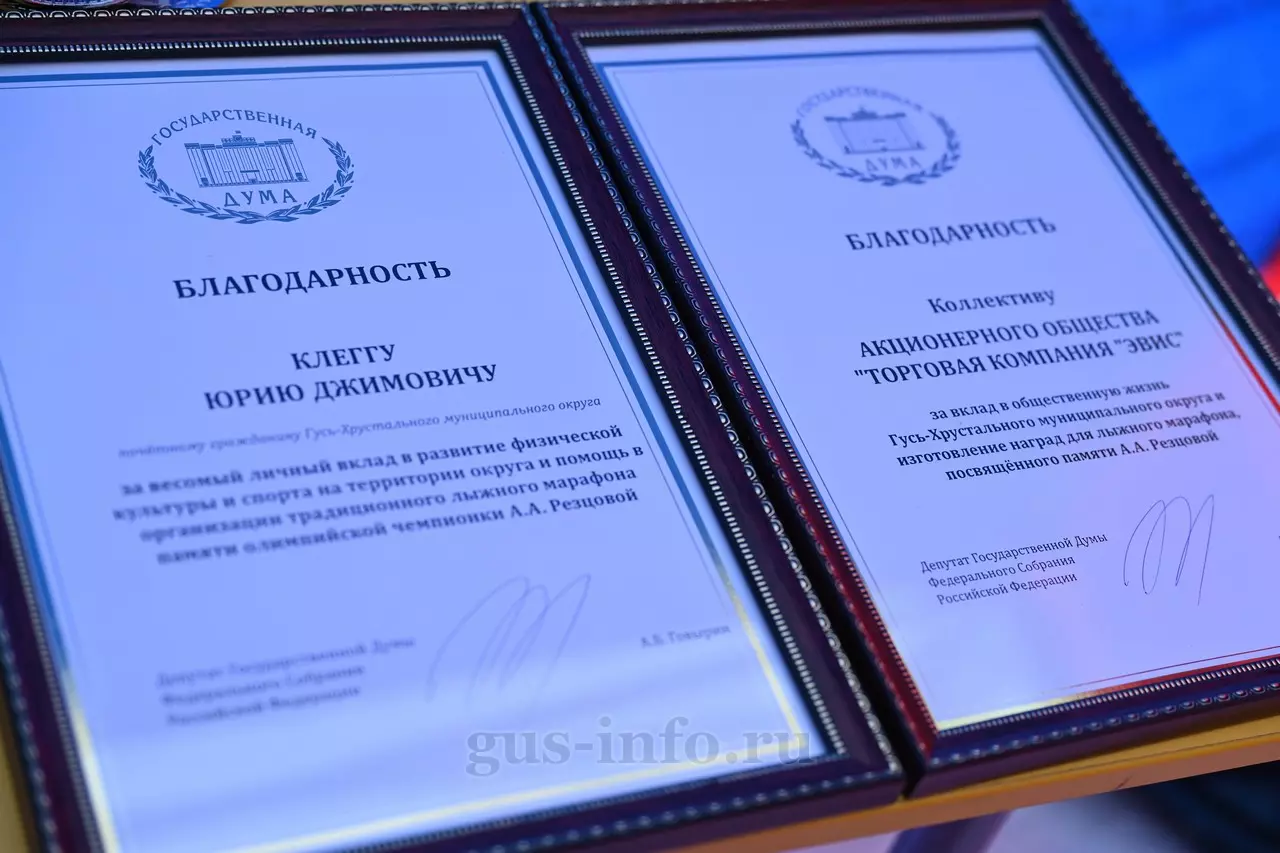 В рамках церемонии награждения глава Гусь-Хрустального муниципального округа Алексей Кабенкин вручил памятные грамоты от имени депутата Государственной Думы РФ Алексея Говырина. Благодарности удостоились Юрий Клегг за неоценимый вклад в организацию марафона и предприятие АО «ТК «ЭВИС», изготовившее для победителей и призёров специальные медали и призы.