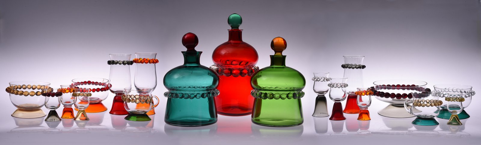 В 1950–1960-е годы на завод приходят профессиональные художники, и это коренным образом меняет эстетику выпускаемой продукции. Появляются новые формы, авторские способы декорирования, разнообразная цветовая палитра. На выставке представлены сервизы и выставочные образцы, авторами проектов которых являются гусевские художники.