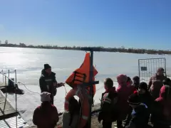 Следующим пунктом экскурсии был берег, где ребятам продемонстрировали спасательные средствах. Юрий Капов рассказал ребятам о «конце Александрова», показал, как нужно правильно бросать его в воду, чтобы утопающий мог поймать его и выбраться из воды. Детей очень заинтересовал этот прием спасения людей, и они по очереди попробовали бросать это спасательное приспособление.