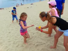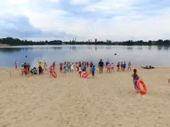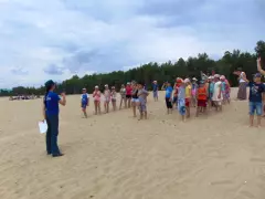 И закипели спортивные страсти! Интеллектуальный конкурс, начавшийся на асфальтовой площадке перед спасательной станцией, сменился активными соревнованиями на песчаном пляже. В первом конкурсе ребятам необходимо было стать «спасателем-водолазом»: обычной ложкой нужно было зачерпнуть воду из озера и донести её до своей команды. Здесь важна была не только скорость, но и аккуратность. На следующем этапе состязаний необходимо было «спасти утопающего», а затем на этапе «Переправа» с помощью спасательного круга «переправить» команду на импровозированный противоположный берег. Все конкурсы проходили под радостные крики болельщиков, поддерживающих участников своих команд. А перед каждым соревнованием сотрудники МЧС рассказывали детям шуточные стихи о правилах безопасного поведения на воде летом.