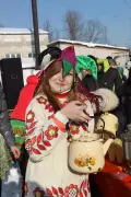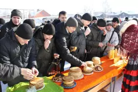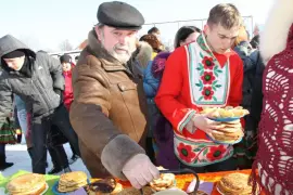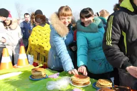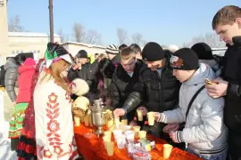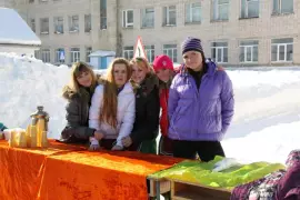 Но самым вкусным был финал. Всех ждало угощение – конечно же, блины и чай из самовара. Кстати, блины готовили сами преподаватели и студенты. Стол ломился от угощений. Варенье черничное, клубничное, кабачковое и сгущёнка были замечательным дополнением к этому изобилию.