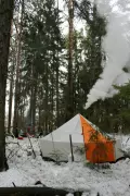 На ночевку вы остановитесь в красивом зимнем лесу в большой палатке с печкой, так что замерзнуть не удастся.