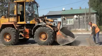 Летнее содержание городских улиц и дорог, в том числе, включает в себя и очистку бордюров от земляных наносов. В Гусь-Хрустальном уборку дорог и бордюров от пыли, грязи и мелкого мусора проводят бригады МУП «Спецпредприятие». Для выполнения ручной уборки в летний период рабочие оснащены совковыми лопатами и сигнальными жилетами. Смет собирается в ковш погрузчика.