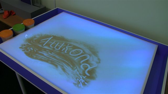 Сенсорная комната в первой школе оснащена проекцией «Лунная ночь» (интерактивной сенсорной панелью с разными режимами, имитирующей звездное небо со светящейся луной и плывущими на фоне ее облаками). Интерактивная доска с песочной терапией способствует успокоению. Работа с песком представляет собой психокоррекцию в невербальной форме, где главным является творческое самовыражение детских переживаний.