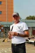 Следующая дисциплина – «Топорная работа»: нужно было последовательно поразить одну мишень А4-го формата, закреплённую в центре стенда, сначала пятью бросками топора с дистанции 4 метра, затем пятью бросками лопаткой с дистанции 5 метров, а затем, перейдя на дистанцию 7 метров вновь поразить ту же мишень снова топором. В этом упражнении наш спортсмен долго был на третьем месте. В своей пятёрке участников Сергей на рубеже был первым, опередив по очкам соперников в 2 раза. К сожалению, в конце упражнения удержаться на 3-ем месте не получилось. Сергей Родиков показал хороший результат, немного уступив сильным и титулованным соперникам, большая часть из них – чемпионы Мира и Европы.