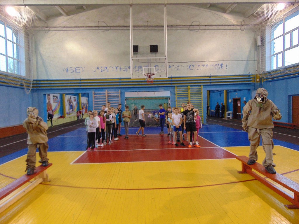 Вторым этапом урока стала эстафета с элементами Гражданской обороны. Разделившись на две команды ребята собрались на старте. Нужно было каждому участнику команды пробежать в противогазе полосу с препятствием, в то время как один из участников команды облачается в универсальный костюм Л-1, который впоследствии должен был завершить эстафету.
