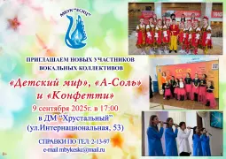 ✅ Вокальные коллективы «Детский мир», «А-Соль» и «Конфетти» (рук. М. В. Земцова, Т. Г. Сумская и Е. Н. Музюкина) - 9 сентября в 17-00