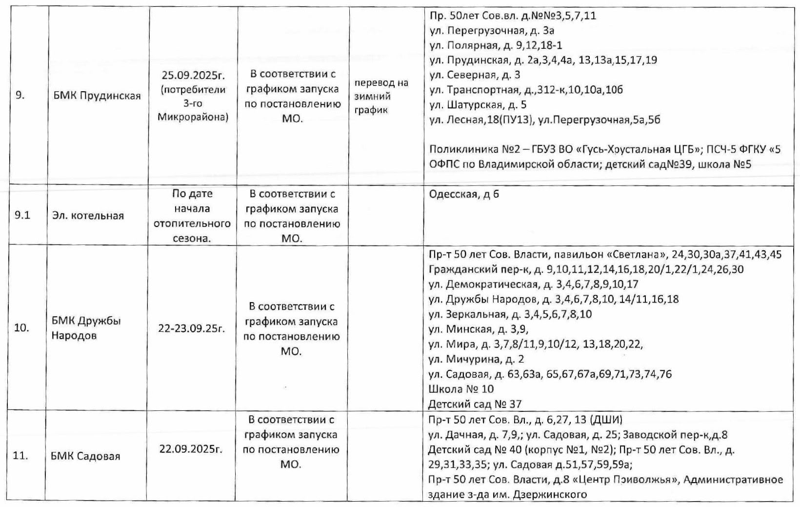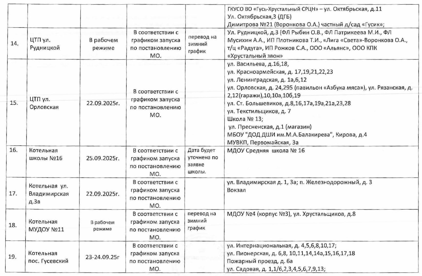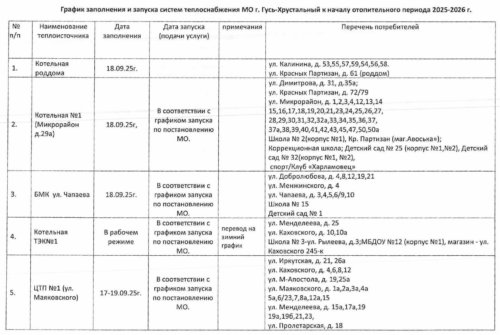 График заполнения систем теплоснабжения в Гусь-Хрустальном к началу отопительного сезона 2025-2026 г.