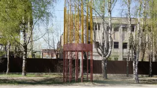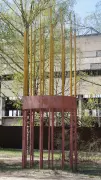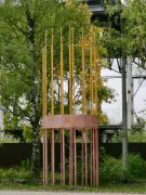 Стела стоит рядом с конторой стеклозавода имени Дзержинского. Сооружение представляет собой вертикальную конструкцию, высотой около восьми метров, выполненную из труб, и украшенную посередине кольцом из металла. Навершием служат флаги, воткнутые в окончание труб.