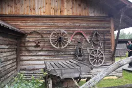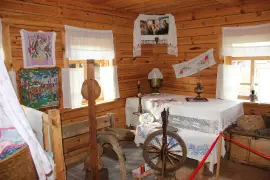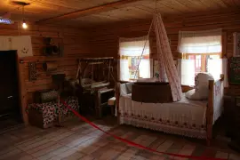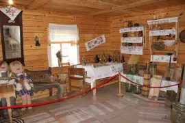 Среди экспонатов множество старинных предметов быта, самовары, сундуки, деревянные шкатулки, приспособления для глажки, прялки.